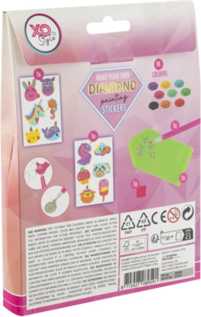 Balenie obsahuje: farebné kamienky, aplikátor, misku, vosk a 12 ks samolepiek. Diamantové maľovanie - postup: Horná strana samolepiek je potiahnutá lepidlom a prekrytá priehľadnou fóliou. Kamienky požadovanej farby vysypte do misky. Do hrotu pera naberte vosk, vďaka ktorému sa kamienky ľahko prichytia na pero a nanášajte na obrázok.