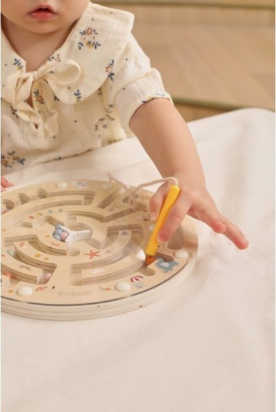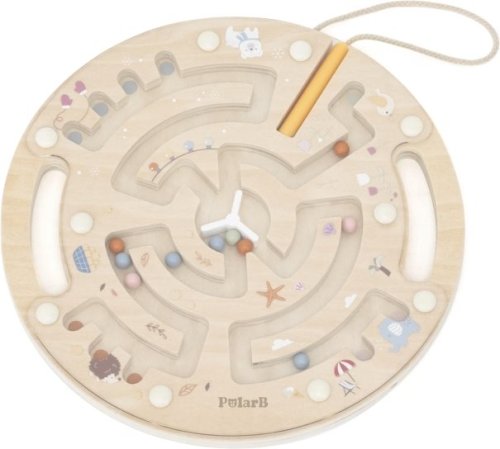 Okrúhla doska z kvalitného dreva obsahuje prepracovaný bludištný systém s farebnými guličkami, ktorými dieťa pohybuje pomocou priloženého pera. Hra podporuje rozvoj jemnej motoriky, koordinácie oko-ruka, sústredenia a trpezlivosti. Vďaka praktickým úchytom po stranách sa hračka ľahko drží a je vhodná aj na cesty. Jemné pastelové farby a roztomilé ilustrácie zapadajú do modernej detskej izby.