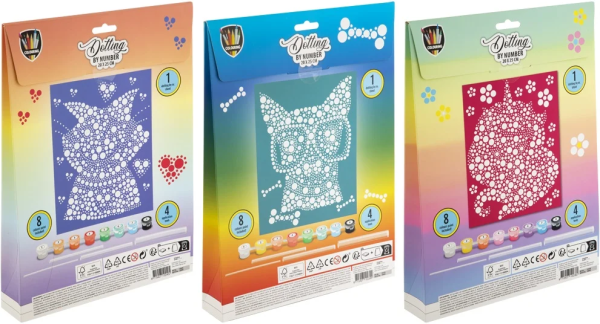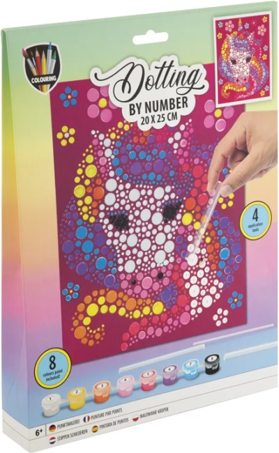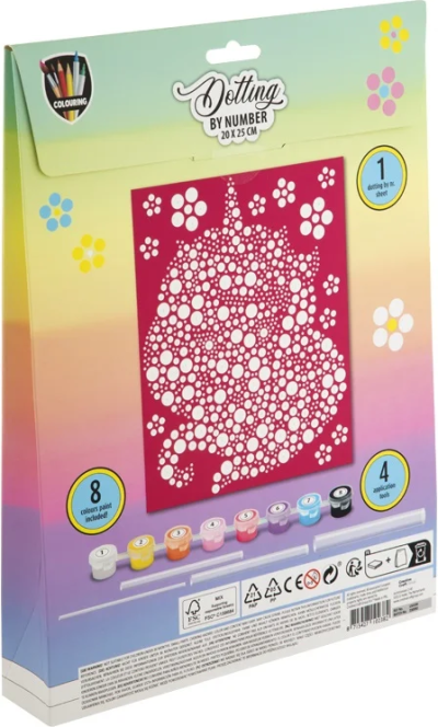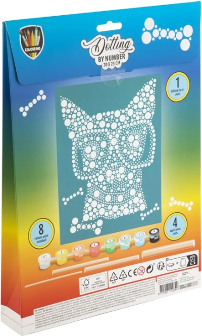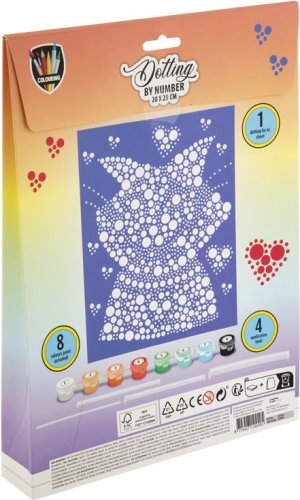 Postupne vytlačujte jednotlivé bodky podľa návodu (každé číslo na plátne zodpovedá jednej konkrétnej farbe). Maľovanie nielen baví, ale aj precvičuje zručnosť a zlepšuje koncentráciu. Balenie obsahuje: obrázok o veľkosti 20 x 25 cm s očíslovanými bodkami, sadu 8 farieb a sadu 4 rôzne veľkých aplikátorov.