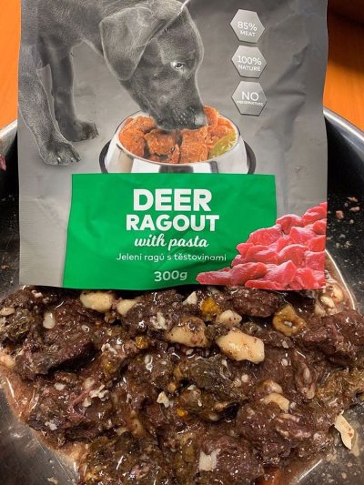 Zloženie: 85% jelenie mäso, 10% cestoviny, 5% mrkva