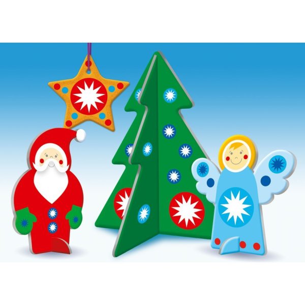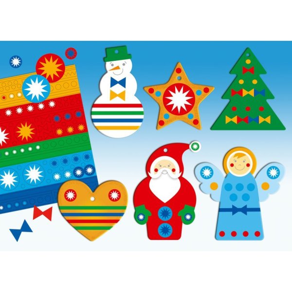 Tematicky zameraná kreatívna súprava, vďaka ktorej si deti môžu vytvoriť nádherné dekoratívne vianočné ozdoby. Mikulášovia, snehuliaci, anjelici, perníčky a stromčeky v niekoľkých veľkostiach čakajú na štyroch hárkoch zo silného, pevného kartónu. Z jednej strany sú tieto motívy farebné a na ich ozdobenie slúži priložený aršík farebných nálepiek rôznych tvarov. Z druhej strany sú všetky tvary biele a poskytujú deťom priestor pre tvorivú prácu s pastelkami, fixkami a pod., a to ako podľa priložených vzorov, tak na základe vlastnej fantázie. Niektoré dekorácie je možné vďaka priloženým stojančekom postaviť, iné zavesiť (šnúrky nie sú súčasťou balenia). Po vytlačení jednotlivých motívov z hárkov umožňuje súprava aj ďalšie využitie – všetky štyri hárky je možné použiť ako šablóny, pomocou ktorých si deti môžu všetky motívy prekresľovať na ľubovoľný podklad a vytvárať tak nekonečné množstvo vlastných ozdôb s najrôznejším dekorom. Detský jednoduchý recept na skvelé dekorácie:1. Vybraný tvar ozdobte pastelkami alebo priloženými nálepkami. 2. Dekorácie je možné zavesiť alebo postaviť do priložených stojančekov. Hotovo! Vianočné sviatky sú kúzelné obdobie. Len ťažko si ich môžeme predstaviť bez stromčeka, perníčkov alebo napríklad snehuliaka! V krabičke nájdete pripravené tvary zo silného kartónu a mnoho farebných nálepiek. Každé dieťa si tak bude môcť ľahko a rýchlo vytvoriť výnimočné vianočné dekorácie podľa priložených vzorov či vlastnej fantázie! Obsah balenia: 1 veľký stromček na postavenie 2 menšie stromčeky na zavesenie3 väčšie figúrky (Mikuláš, anjelik a snehuliak) do stojanu6 figúrok v dvoch veľkostiach (2 Mikulášovia, 2 anjelici a 2 snehuliaci) na zavesenie6 perníčkov v troch veľkostiach (3 srdiečka ) na zavesenie3 stojančeky4 hárky šablón (vzniknú po vytlačení jednotlivých motívov)1 hárok s farebnými samolepkami Hlavné vlastnosti: rozvíja pozorovacie schopnosti a rozširuje slovnú zásobuzdokonaľuje jemnú motoriku a priestorovú predstavivosť Dokumentácia: návod k hre SK