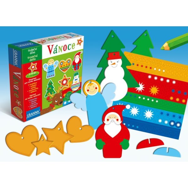 Tematicky zameraná kreatívna súprava, vďaka ktorej si deti môžu vytvoriť nádherné dekoratívne vianočné ozdoby. Mikulášovia, snehuliaci, anjelici, perníčky a stromčeky v niekoľkých veľkostiach čakajú na štyroch hárkoch zo silného, pevného kartónu. Z jednej strany sú tieto motívy farebné a na ich ozdobenie slúži priložený aršík farebných nálepiek rôznych tvarov. Z druhej strany sú všetky tvary biele a poskytujú deťom priestor na tvorivú prácu s pastelkami, fixkami a pod., a to ako podľa priložených vzorov, tak na základe vlastnej fantázie. Niektoré dekorácie je možné vďaka priloženým stojančekom postaviť, iné zavesiť (šnúrky nie sú súčasťou balenia). Po vytlačení jednotlivých motívov z hárkov umožňuje súprava aj ďalšie využitie – všetky štyri hárky je možné použiť ako šablóny, pomocou ktorých si deti môžu všetky motívy prekresľovať na ľubovoľný podklad a vytvárať tak nekonečné množstvo vlastných ozdôb s najrôznejším dekorom. Obsah balenia:1 veľký stromček na postavenie2 menšie stromčeky na zavesenie3 väčšie figúrky (Mikuláš, anjelik a snehuliak) do stojanu6 figúrok v dvoch veľkostiach (2 Mikulášovia,2 anjelici a 2 snehuliaci) na zavesenie6 perníčkov v troch veľkostiach3 srdiečka a3 (vzniknú po vytlačení jednotlivých motívov)1 aršík s farebnými samolepkami