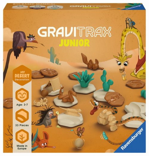 GraviTrax Junior je interaktívny systém guličkovej dráhy pre deti od 3 rokov. Tí najmenší si stavajú svoje vlastné svety z guličkových dráh, ktoré je možné podľa ľubovôle zdobiť a vytvárať tak jednotlivé tematické svety. Deti si tak pri kreatívnom stavaní užijú mnoho zábavy. Chlapci a dievčatá si môžu stavať svoje vlastné svety z guličkových dráh, ktoré je možné podľa ľubovôle zdobiť a vytvárať tak jednotlivé tematické svety. Vďaka tomuto rozšíreniu Púšť, ktoré obsahuje najrôznejšie púštne prvky a postavičky zvierat deti zažijú svet púšte zblízka. Všetky stavebné a dekoračné súčasti sú vyrobené z dreveného bioplastu.