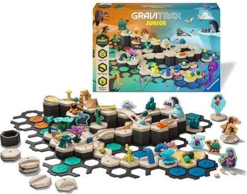 GraviTrax Junior je interaktívny systém guličkovej dráhy pre deti od 3 rokov. Tí najmenší si stavajú svoje vlastné svety z guličkových dráh, ktoré je možné podľa ľubovôle zdobiť a vytvárať tak jednotlivé tematické svety. Deti si tak pri kreatívnom stavaní užijú mnoho zábavy. GraviTrax Junior Štartovacia sada Môj svet obsahuje všetko, čo potrebujete, aby ste mohli ihneď začať stavať a ponoriť sa do tematických svetov džungle, ľadu, púšte a oceánu. S rôznymi dekoračnými prvkami a figúrkami zvierat a rastlín vyrobených z dreveného bioplastu môžu deti od 3 rokov zažiť zblízka 4 tematické svety, ktoré si môžu pri hre ľubovoľne vyzdobiť. Táto XXL tematická štartovacia sada obsahuje 200 dielikov vrátane doplnkov Hojdačka a Kladivo, čím ponúka neobmedzenú zábavu pre všetkých malých fanúšikov GraviTraxu. Deti si pri kreatívnom stavaní užijú mnoho zábavy.