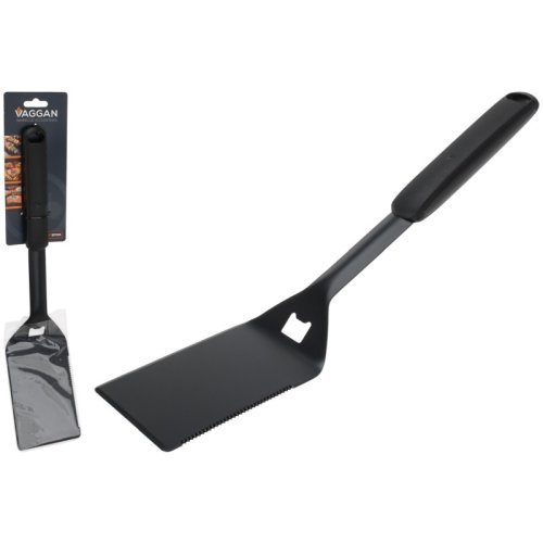 obracačka na grilovanie, celková dĺžka 465mm s otváračom na fľaše v obracačke, hrúbka 1,8mm, čierny nepriľnavý (ptfe) kov potiahnutý (nerezová oceľ ss430) s tpe a pp rukoväťou 18cm
