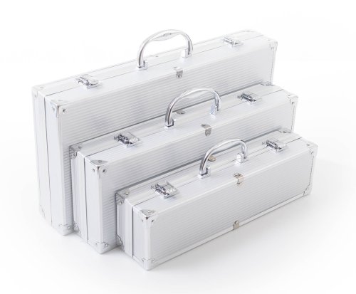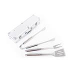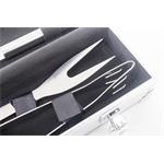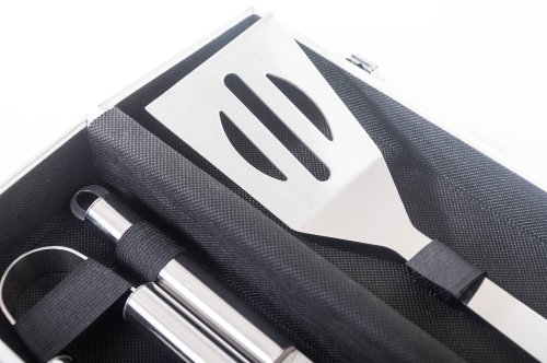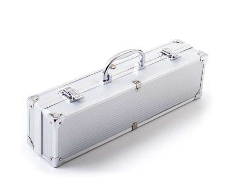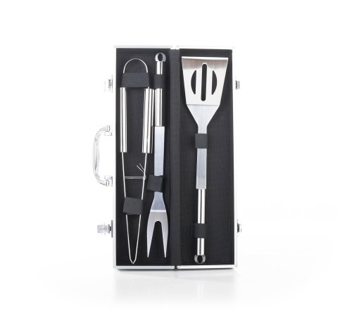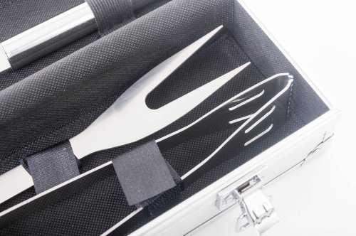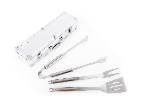 Sada obsahuje kompletné nástroje na grilovanie bez problémov. Súčasťou sady je obracačka, vidlička a kliešte s dĺžkou 34 cm. Pre ľahké prenášanie a skladovanie je náradie uložené do praktického hliníkového kufra.