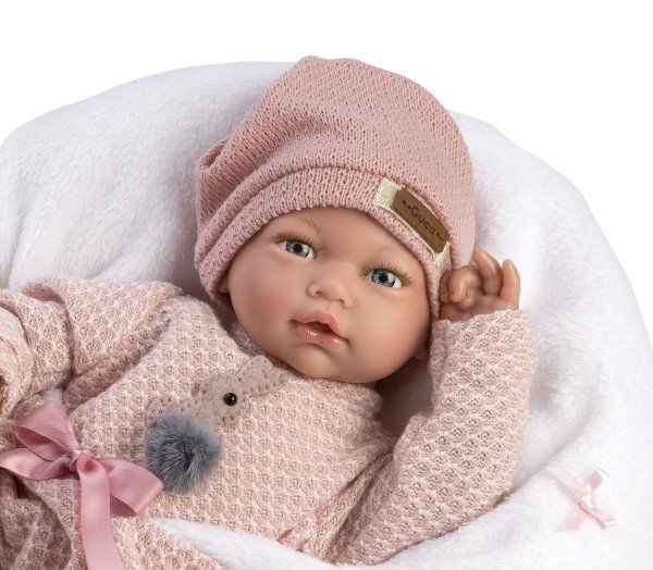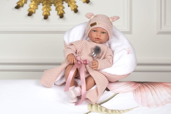 Zvuková bábika bábätko s mäkkým látkovým telom, ktorá po zatlačení na hrudník začne vydávať reálny zvuk smejúceho sa dieťaťa. Ruky a nohy sú k telu prichytené kĺbom. Bábätko je polohovacie a môže aj sedieť. Veľkosť 38 cm. Ručne vyrobené v Španielsku, balené v darčekovej krabici. Odporúčaný vek od 3 rokov. Súčasťou balenia je 3 x gombíková batéria LR44 s návodom na jej výmenu. Batérie sú spotrebný tovar a preto ich vybitie nie je dôvodom na reklamáciu bábiky.