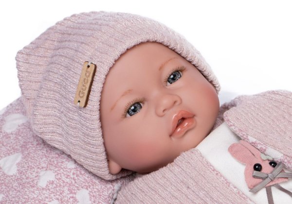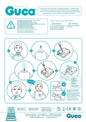 Zvuková bábika bábätko s mäkkým látkovým telom, ktorá po zatlačení na hrudník začne vydávať reálny zvuk smejúceho sa dieťaťa. Ruky a nohy sú k telu prichytené kĺbom. Bábätko je polohovacie a môže aj sedieť. Veľkosť 46 cm. Ručne vyrobené v Španielsku, balené v darčekovej krabici. Odporúčaný vek od 3 rokov. Súčasťou balenia je 3 x gombíková batéria LR44 s návodom na jej výmenu. Batérie sú spotrebný tovar a preto ich vybitie nie je dôvodom na reklamáciu bábiky.