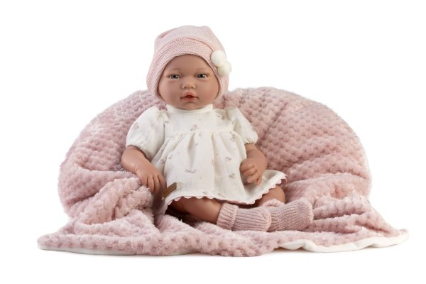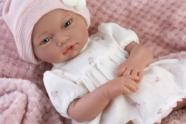Bábika bábätko bez zvuku s mäkkým látkovým telom. Ruky a nohy sú k telu prichytené kĺbom. Bábätko je polohovacie a môže aj sedieť. Veľkosť 38 cm. Ručne vyrobené v Španielsku, balené v darčekovej krabici. Odporúčaný vek od 3 rokov.
