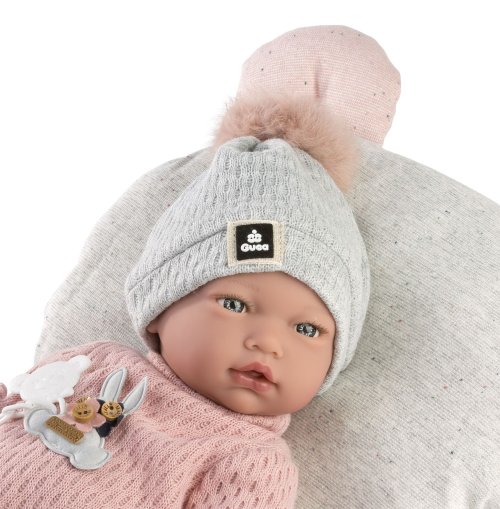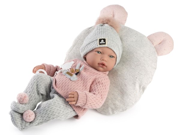 Zvuková bábika bábätko s mäkkým látkovým telom, ktorá po zatlačení na hrudník začne vydávať reálny zvuk smejúceho sa dieťaťa. Ruky a nohy sú k telu prichytené kĺbom. Bábätko je polohovacie a môže aj sedieť. Cumlík v balení slúži iba ako doplnok. Veľkosť 38 cm. Ručne vyrobené v Španielsku, balené v darčekovej krabici. Odporúčaný vek od 3 rokov. Súčasťou balenia je 3 x gombíková batéria LR44 s návodom na jej výmenu. Batérie sú spotrebný tovar a preto ich vybitie nie je dôvodom na reklamáciu bábiky.