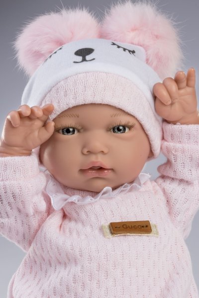 Zvuková bábika bábätko s mäkkým látkovým telom, ktorá po zatlačení na hrudník začne vydávať reálny zvuk smejúceho sa dieťaťa. Ruky a nohy sú k telu prichytené kĺbom. Bábätko je polohovacie a môže aj sedieť. Cumlík v balení slúži iba ako doplnok. Veľkosť 38 cm. Ručne vyrobené v Španielsku, balené v darčekovej krabici. Odporúčaný vek od 3 rokov. Súčasťou balenia je 3 x gombíková batéria LR44 s návodom na jej výmenu. Batérie sú spotrebný tovar a preto ich vybitie nie je dôvodom na reklamáciu bábiky.
