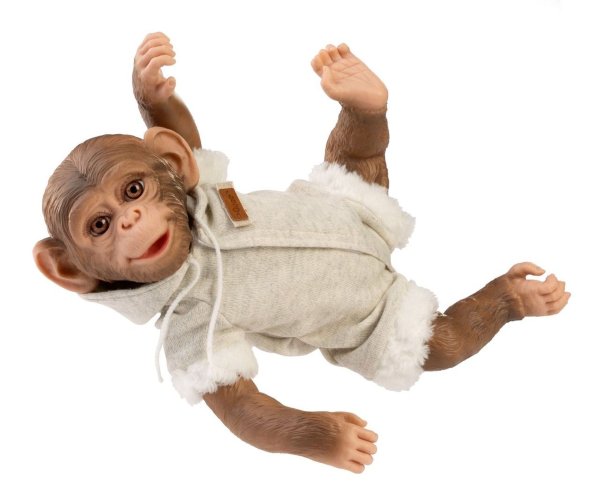 Veselé a roztomilé opičia bábätko bez zvuku s mäkkým látkovým telom. Hlava a končatiny sú vyrobené z kvalitného vinylu. Ruky a nohy sú k telu prichytené kĺbom. Opičie bábätko je polohovacie a môže aj sedieť alebo sa dá zavesiť za ruky alebo nohy. Veľkosť 32 cm. Ručne vyrobené v Španielsku, balené v darčekovej krabici. Odporúčaný vek od 3 rokov.