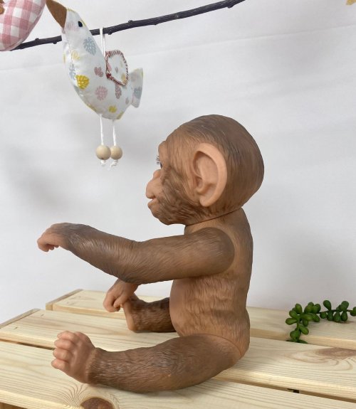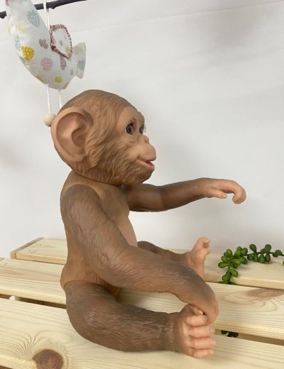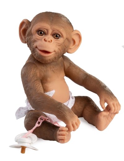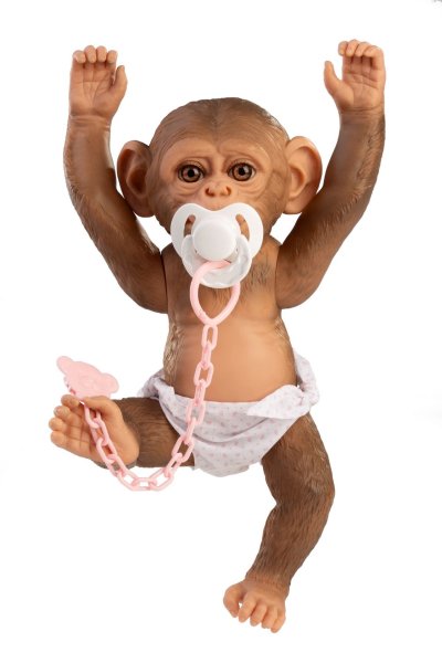 Veselé a roztomilé opičie bábätko bez zvuku s vinylovým telom s možnosťou kúpania, na ktorom je zachytený vierohodne každý detail tohto zvieracieho mláďatká vrátane rôznych záhybov, okrem pohlavia. Opičku je možné kúpať, ale je potrebné dať pozor, aby sa jej nenamočili riasy. Odlepené riasy nie sú potom dôvodom na reklamáciu. Ruky a nohy sú k telu prichytené kĺbom. Opičie bábätko je polohovacie a môže aj sedieť alebo sa dá zavesiť za ruky alebo nohy. Cumlík v balení slúži iba ako doplnok. Veľkosť 32 cm. Ručne vyrobené v Španielsku, balené v darčekovej krabici. Odporúčaný vek od 3 rokov.
