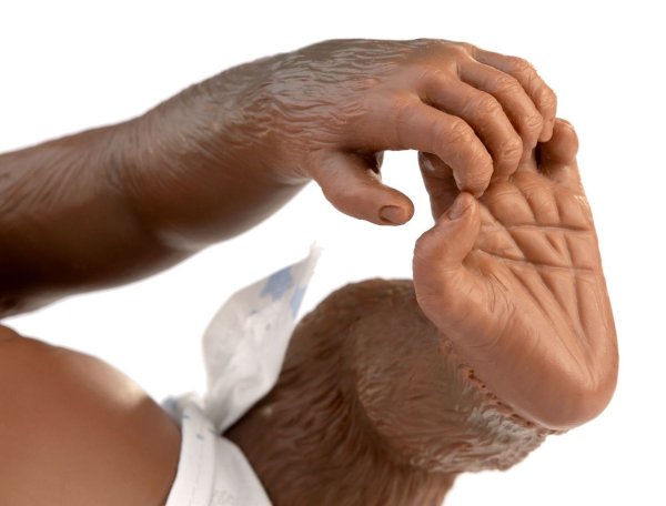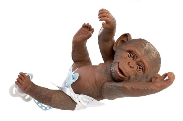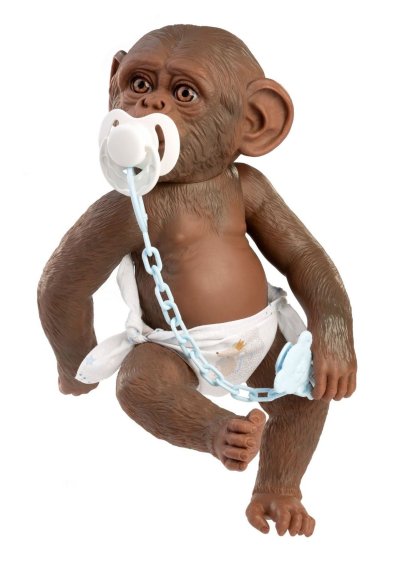 Veselé a roztomilé opičie bábätko bez zvuku s vinylovým telom s možnosťou kúpania, na ktorom je zachytený vierohodne každý detail tohto zvieracieho mláďatká vrátane rôznych záhybov, okrem pohlavia. Opičku je možné kúpať, ale je potrebné dať pozor, aby sa jej nenamočili riasy. Odlepené riasy nie sú potom dôvodom na reklamáciu. Ruky a nohy sú k telu prichytené kĺbom. Opičie bábätko je polohovacie a môže aj sedieť alebo sa dá zavesiť za ruky alebo nohy. Cumlík v balení slúži iba ako doplnok. Veľkosť 32 cm. Ručne vyrobené v Španielsku, balené v darčekovej krabici. Odporúčaný vek od 3 rokov.