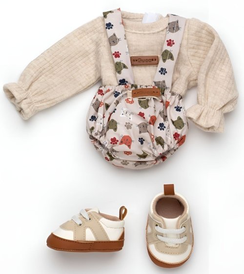 3dielny set: 2 kusy oblečenia a topánočky pre opičku bábätko REBORN veľkosti 32 cm. Vyrobené ručne v Španielsku, balené v igelitovom obale na kartónovej podložke. Odporúčaný vek od 3 rokov.