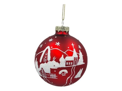 Guľa sklo 80 mm na stromček dedinka, červená