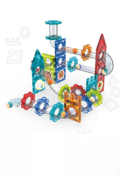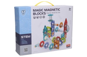 Guľôčková dráha magnetická set. Balenie obsahuje 74 ks. Obsahuje magnetickú stavebnicu s tunelmi na tvorbu guličkovej dráhy, nálepky, návod, guličky.