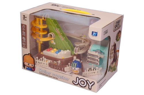 Guľôčková dráha skrutkovacia. Veľkosť dráhy 18 cm. Obsah balenia - skrutkovacia dráha, 6 guličiek, panáčik, ploty, domček na predaj lístkov, skrutkovač.