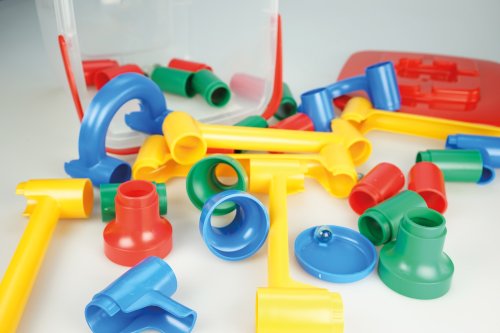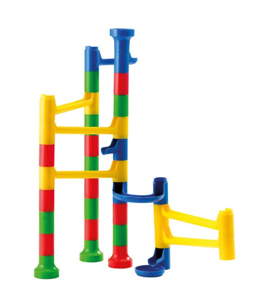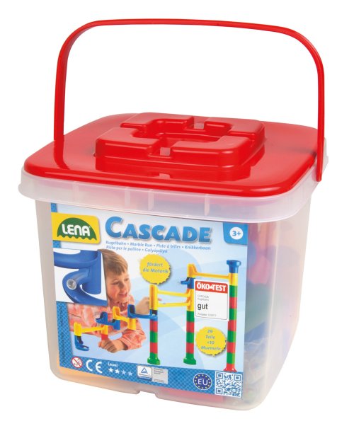 Farebná, plastová guličková dráha vo vedierku. Rôzne variácie dráh. Ľahko prenositeľná. 29 dielov, 10 guličiek.