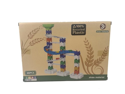 Zostav si vlastnú guličkovú dráhu z 58 dielikov! Výrobok podporuje kreativitu a predstavivosť. Vyrobené z prírodných materiálov, 100% recyklovaný plast.