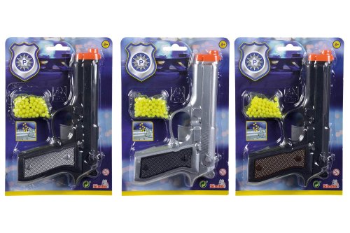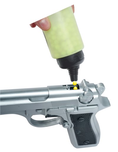Súprava obsahuje zbraň a 100 nábojov/guličiek. Zásobník sa plní guličkami v hornej časti zbrane a po stlačení spúšte je gulička vystrelená pružinou. Pištoľ je vyrobená z plastu, 3 druhy - v striebornej, čiernej alebo hnedej farbe. Dĺžka pištole 21 cm.
