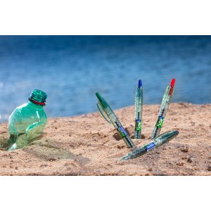 Guľôčkové pero Pilot B2P Ecoball so stiskacím mechanizmom, vyrobené z 86% z recyklovaných plastových fliaš s podielom min. 2,5 % recyklovaného oceánskeho plastu.