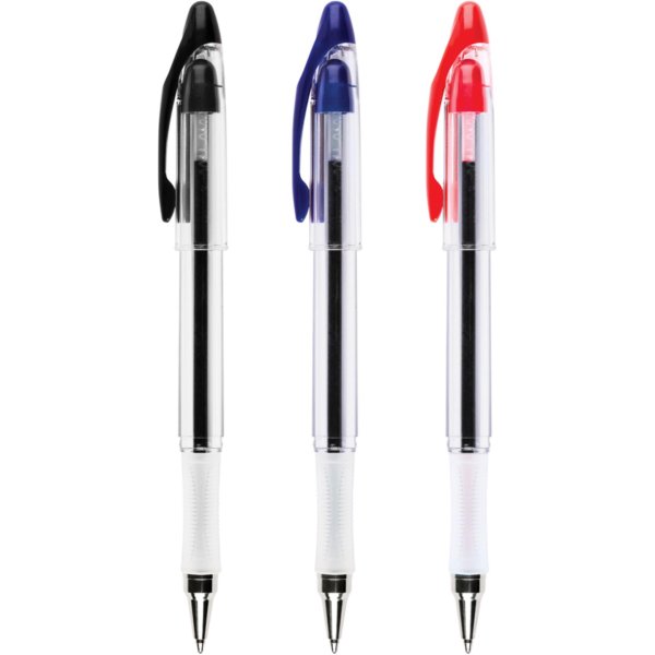 Plastové transparentné telo, gumový ergonomicky tvarovaný grip, s klipom Originálne balenie: 12 ks Šírka hrotu: 0,7 mm Farba: modrá