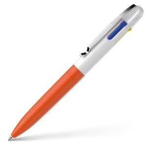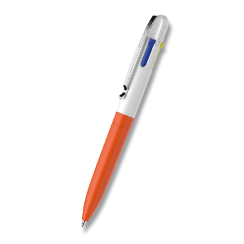 4farebné guľôčkové pero s modrou, čiernou, neónovo oranžovou a neónovo žltou náplňou. Atrament s Viscoglide® technológiou na hladké písanie. Telo ceruzky je vyrobené z 92% z recyklovateľného plastu v dvoch farebných prevedeniach. Stláčací mechanizmus je umiestnený po strane. Odolný kovový klip M. Šírka stopy 0,4 mm.