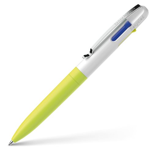 4farebné guľôčkové pero s modrou, čiernou, neónovo zelenou a neónovo žltou náplňou. Atrament s Viscoglide® technológiou na hladké písanie. Telo ceruzky je vyrobené z 92% z recyklovateľného plastu v dvoch farebných prevedeniach. Stláčací mechanizmus je umiestnený po strane. Odolný kovový klip M. Šírka stopy 0,4 mm.