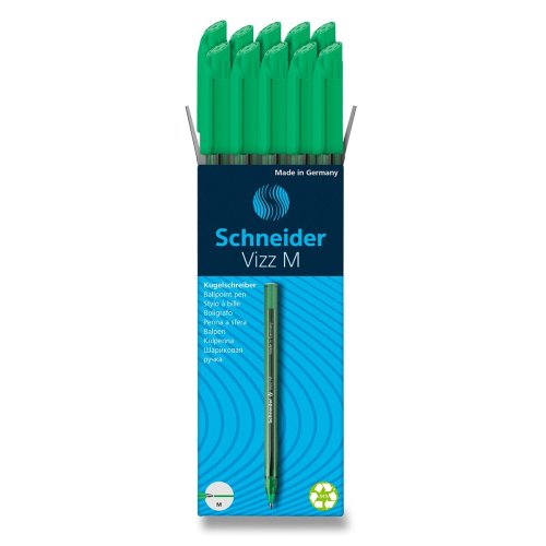 Jednorazové guličkové pero Schneider Vizz s telom vo farbe náplne. Vyrobené z 94% z recyklovaného plastu. Inovatívna technológia atramentu Gelco® poskytuje rovnaký komfort pri písaní ako pri gélovej náplni. Desať farebných prevedení. Hrot o šírke 1 mm.