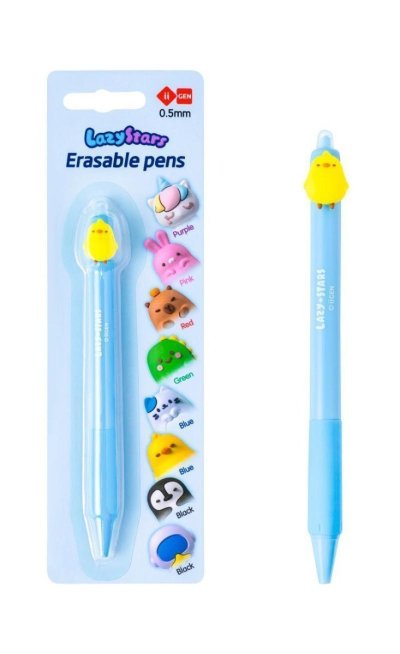 Klikacie gumovacie gélové pero s motívom Kačičky. Hrúbka hrotu 0,5 mm, atrament modrý, na blister karte.