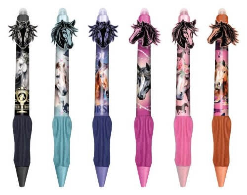 Koniec chybám a škrtanie v zošitoch. Jednoducho ich vymaž a prepíš. Pevná guma na konci pera a jedinečné zloženie atramentu zaručuje jednoduché a opakované gumovanie. K dispozícii náhradná náplň.brKolekcia gumovateľných pier s krásnymi motívmi divokých koní. Výrazná stláčacia mechanika, farebne zladené telo a na dotyk príjemný pogumovaný grip, tí navyše zaručia pohodlné a radostné písanie.