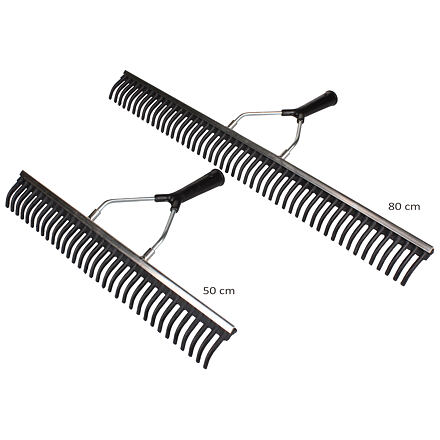 Hrable určené na šetrné odstránenie opadaného lístia alebo odpadkov z tenisových kurtov. Vyrobené z kvalitnej gumy, ocele a PVC. Pri použití týchto hrablí nedochádza k narušeniu samotného povrchu ihriska a to tak zostane neponičené. Hrable ponúkame v dvoch šírkach (50 a 75 cm). Dodávané sú iba samostatné hrable bez násady.