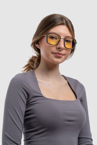 Kancelárske okuliare s jantárovými sklami a jedinečným dizajnom, určené najmä na dlhú prácu či hranie na počítači. Tento retro-futuristický štýl hranatých obrúčok má prednú časť z nerezovej ocele a nylonu zakončenú olivovými kovovými nožičkami. Okuliare blokujú 65% modrého svetla a 100% ultrafialového žiarenia , vďaka čomu minimalizujú zaťaženie očí a celkovú únavu. O maximálny komfort sa postarajú ergonomicky tvarované sedlá, zatiaľ čo pevná konštrukcia rámu a bočné štíty zaistia správnu optickú stabilitu.