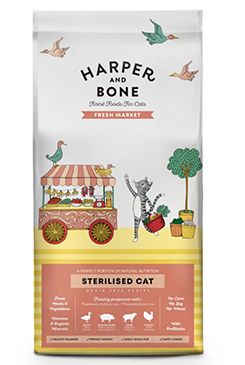 Harper and Bone Cat Sterilised čerstvé z trhu zložené iba z najkvalitnejších surovín s vysokým podielom mäsa, prídavkom superpotravín a čerstvej zeleniny, zaručujúce prospešné živiny a prirodzenú chuť pre dokonale vyváženú výživu.