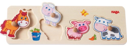 štyri vkladacie obrázky - koník, ovečka, kravička a prasiatko úchytky sú (rovnako ako celý výrobok) z prírodného materiálu rozvíja predstavivosť, jemnú motoriku a priestorové vnímanie