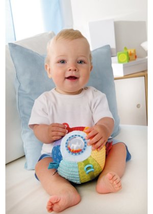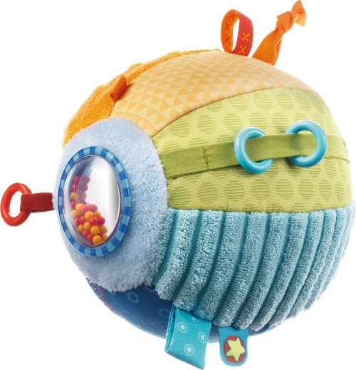 T extilná lopta pre najmenšie deti vyrobená z hebkého a pestrofarebného materiálu. Látková lopta stimuluje zmyslové vnemy a jemnú motoriku. Dieťaťu ponúka veselý pohyb plný milých prekvapení, medzi ktorými nechýbajú rôzne druhy povrchov, zrkadlo ani hrkálka. Priemer lopty: 15 cm Vhodné pre deti od 6 mesiacov.
