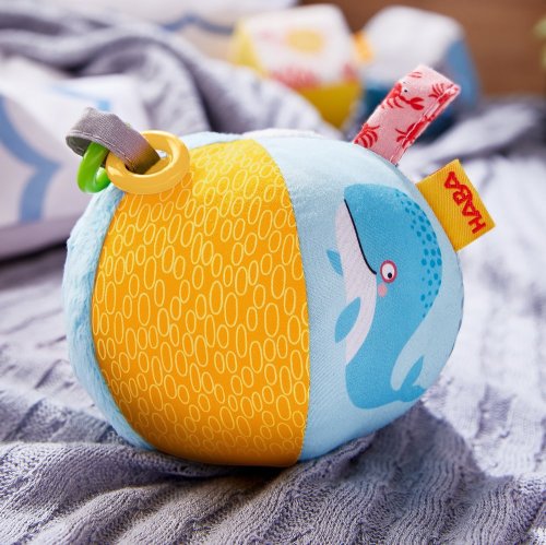 T extilná lopta pre najmenšie deti vyrobená z hebkého a pestrofarebného materiálu. Látková lopta stimuluje zmyslové vnemy a jemnú motoriku. Dieťaťu ponúka veselý pohyb plný milých prekvapení, medzi ktorými nechýbajú rôzne druhy povrchov, rolnička alebo pískanie. Priemer lopty: 12 cm Vhodné pre deti od 6 mesiacov.