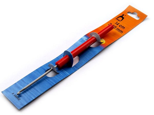 Háčik je vhodný na háčkovanie vlny. Je vyrobený zo zliatiny hliníka a opatrený plastovou rukoväťou pre pohodlnejšie uchopenie. Môžete si vybrať z veľkostí 2, 2,5, 3 a 3,5.