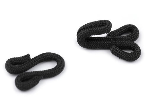 Kovový háčik s očkom je potiahnutý textíliou. Používa sa ako zapínanie u odevov, najčastejšie u viest alebo svetrov. Môžete ho využiť aj na tašky, kabelky a pod. [Časť s háčikom má dĺžku 20 mm, časť s očkom má dĺžku 20 mm. Celková dĺžka po zapnutí je 36 mm.]