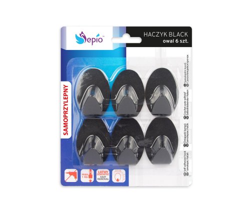 Háčik samolepiaci, oválny, oceľ ČER (6 ks). rozmery (š xv): 3,6 x 5,3 cm materiál: oceľ farba: čierna balenie: 6 ks Oválny samolepiaci háčik.