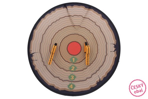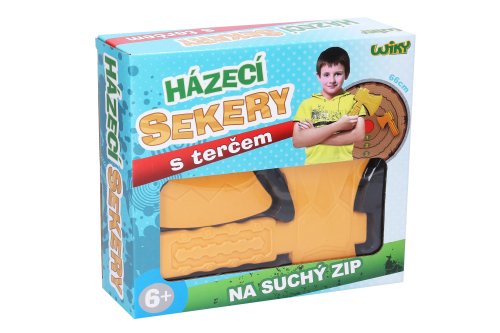 Súčasťou je terč s prísavkami, ktorý jednoducho pripevníte na stenu a 2 sekery so suchým zipsom.