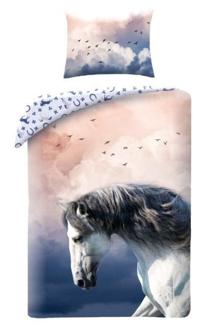 HALANTEX Obliečky Kôň sky 140/200, 70/90 Materiál: 100% Bavlna Rozmer: 1x 140/200, 1x 70/90 cm Bavlnené obliečky na veľkú posteľ, zapínanie na zips, motív periny je z každej strany iný, možnosť prania na °C