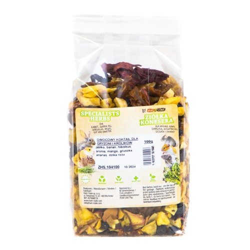 Ovocný koktail je chutná a výživná doplnková zmes sušeného ovocia určená pre hlodavce a králiky. Základné krmivo často nepokrýva všetky nutričné potreby malých zvierat, preto je vhodné ich jedálniček obohatiť o prírodné ovocné doplnky. Vďaka šetrnému sušeniu si ovocie zachováva cenné vitamíny, minerály a vlákninu, ktoré podporujú zdravie a vitalitu vašich maznáčikov.