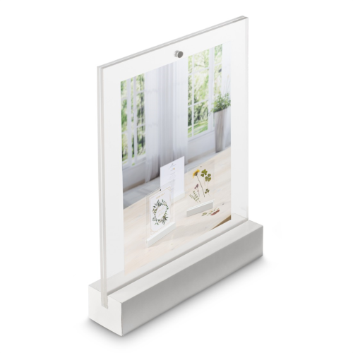 • moderný akrylový stojanček na fotografie s bielou základňou z MDF materiálu