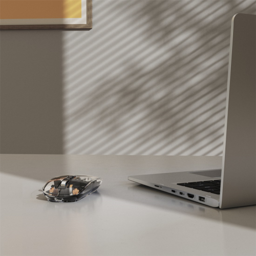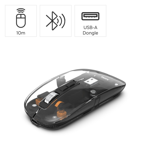 - 6tlačítková bezdrôtová optická myš s voliteľným pripojením na tri zariadenia: 1x bezdrôtový USB prijímač a 2x Bluetooth - atraktívne prevedenie s priehľadným horným krytom - vďaka plochému tvaru sa zmestí …