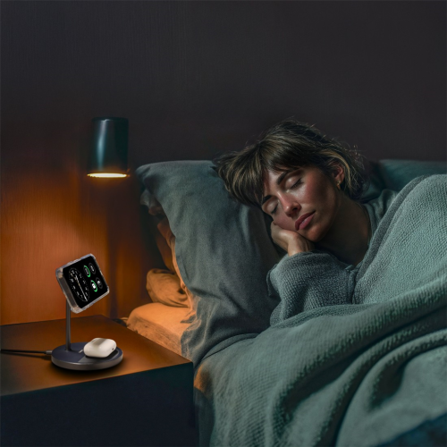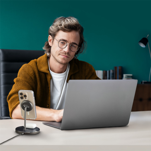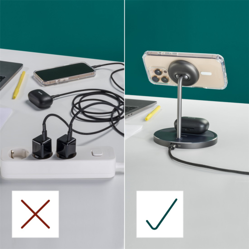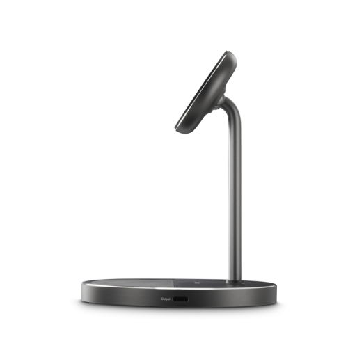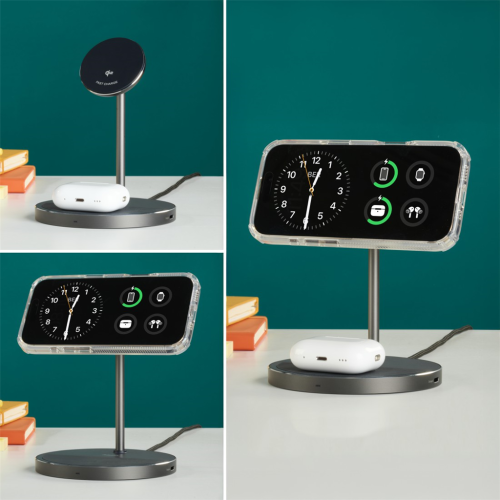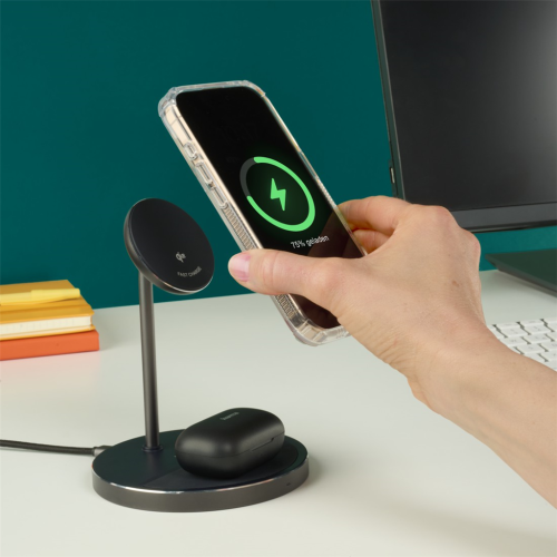 • stolná bezdrôtová nabíjačka pre dve zariadenia súčasne: magnetický držiak pre telefón a nabíjacia podložka pre slúchadlá
