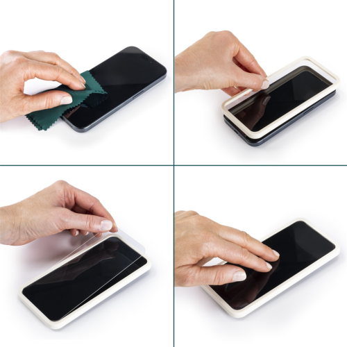 • jednoduchá aplikácia v 3 krokoch: vyčistite displej telefónu, umiestnite EcoFrame upevňovaciu pomôcku na displej a následne umiestnite na vrch ochranné sklo