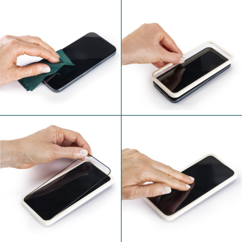 • jednoduchá aplikácia v 3 krokoch: vyčistite displej telefónu, umiestnite EcoFrame upevňovaciu pomôcku na displej a následne umiestnite na vrch ochranné sklo