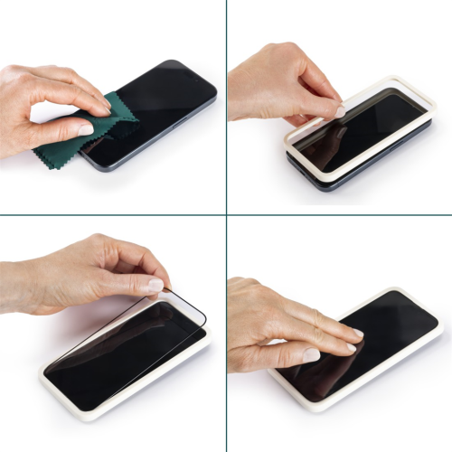 • jednoduchá aplikácia v 3 krokoch: vyčistite displej telefónu, umiestnite EcoFrame upevňovaciu pomôcku na displej a následne umiestnite na vrch ochranné sklo